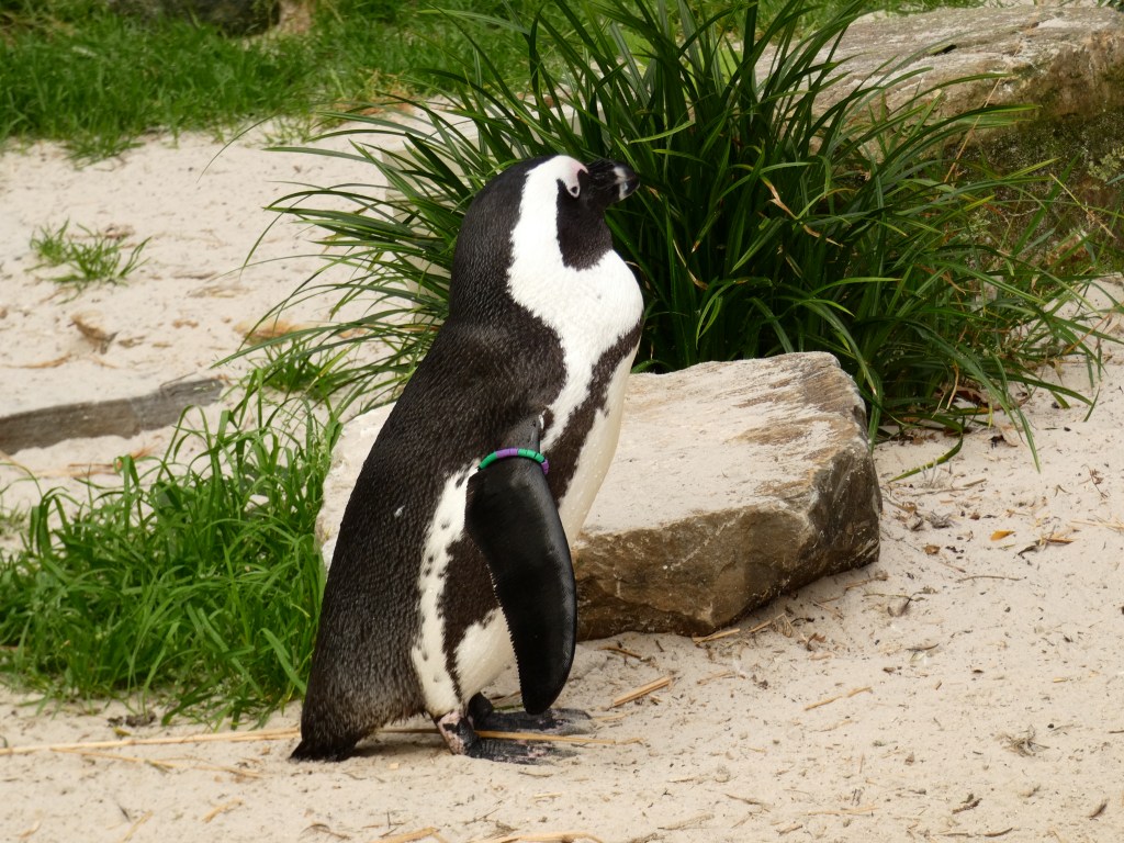 This is a cute South-African penguin called ; Blackfeet penguin, they love warmth and water and they are thriving in the zoo.