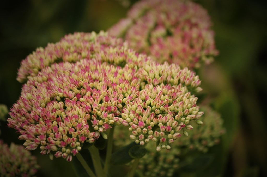 WHEN THIS SEDUM IS IN BLOOM SUMMER IS AS GOOD AS OVERDRY GRASSES IN FRONT OF A MARSH AND A LITTLE SPIDERMUSHROOMSMORE MUSHROOMSBERRIESWILD HEATHERPART OF A DEAD PINE THREEWITH PINE CONESAMELANCHIER OR JUNE BERRY